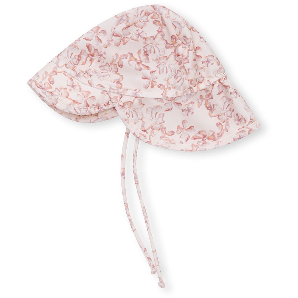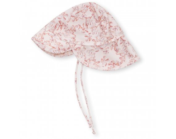 Yndig bade- og solhat med sødt blomsterprint. Badehat med skygge for og bag, samt et bindebånd og elastik i nakken. Den er fremstillet af et strækbart materiale, har solfaktor UV50 beskyttelse og er lavet i genanvendt polyester, der er fremstillet af opsamlet plast fra verdenshavene.