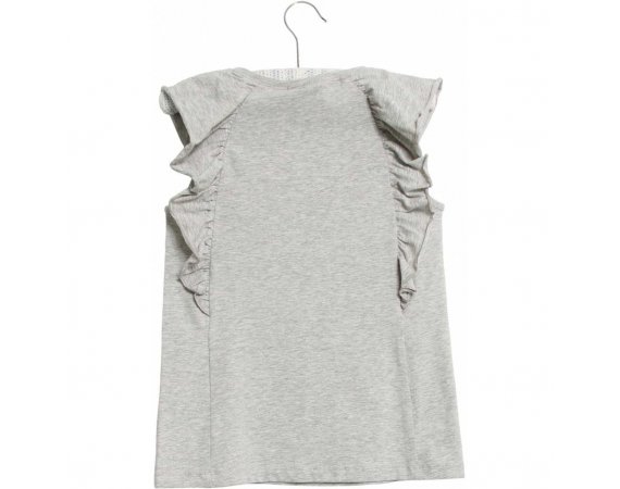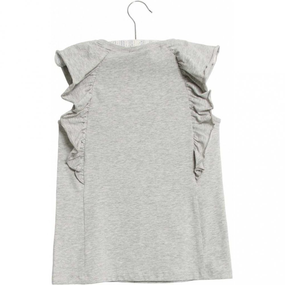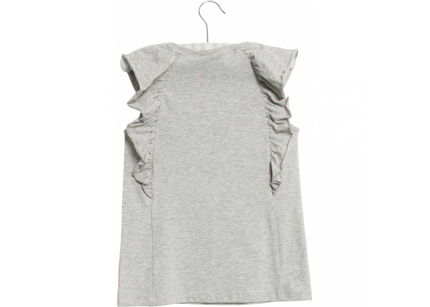 T-shirten er uden ærmer, men har en sød flæseetalje ved skuldre og et sejt is glitter print på brystet.