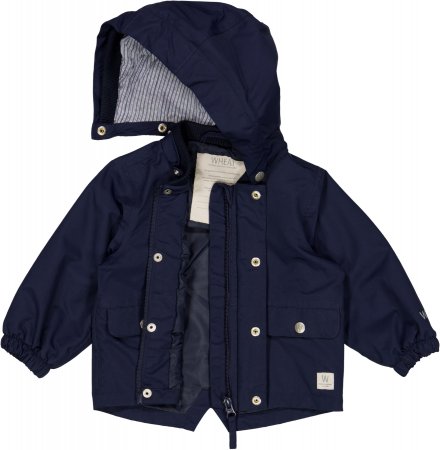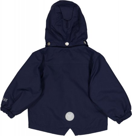 Skøn forårs- og sommerjakke i blå farve. Jakken går længere ned bagpå med en lille slids. Den har en skjult stolpelukning og elastik ved håndled. Jakken har lommer med knaplukning, aftagelig og justerbar hætte, lynlås og knapper foran. Jakken er produceret i 100% genanvendt nylon og har fine elg og logo refleksdetaljer.