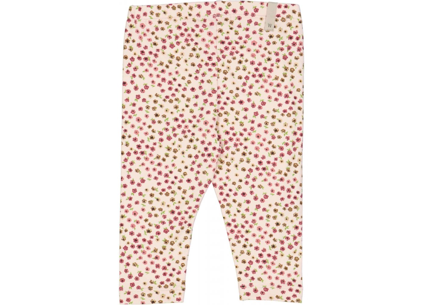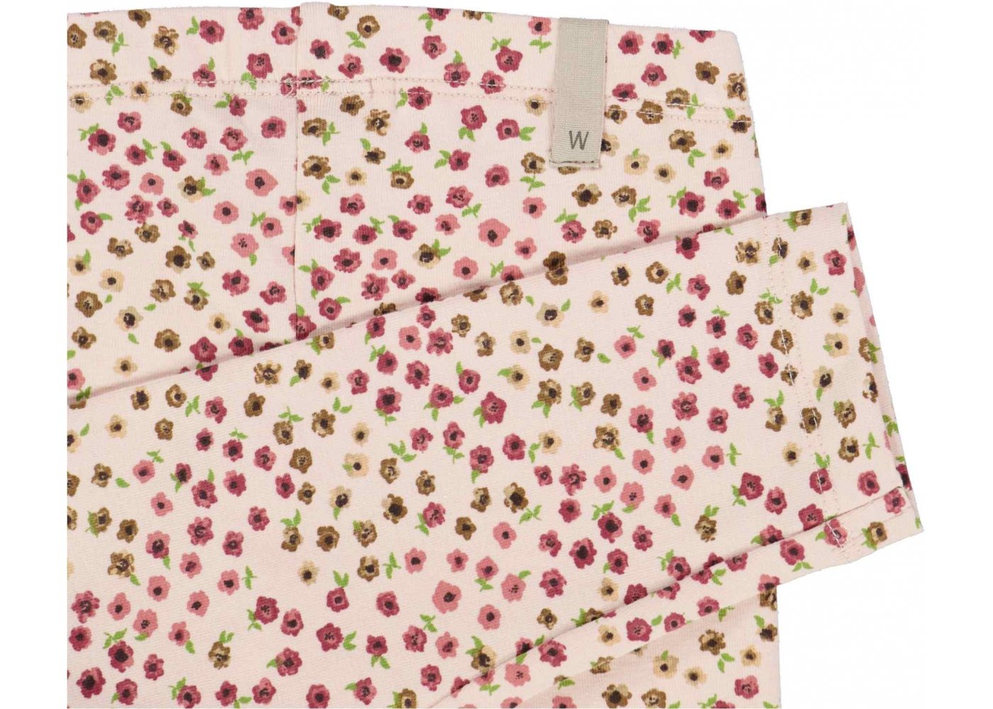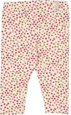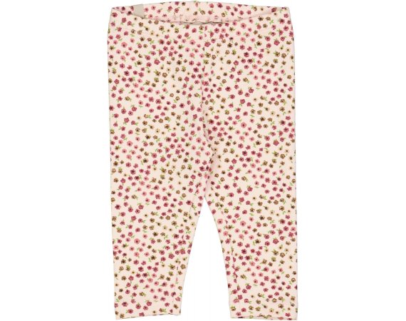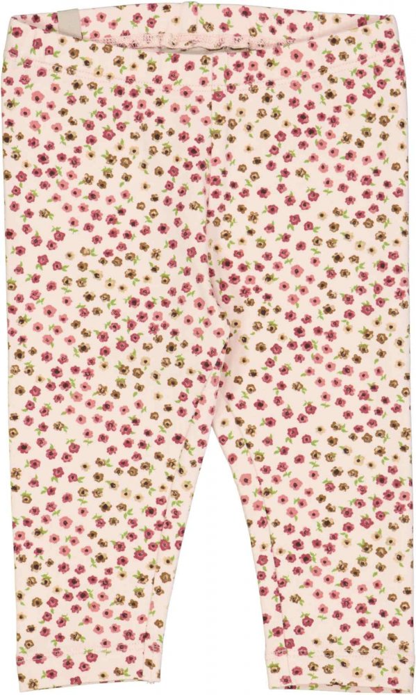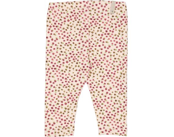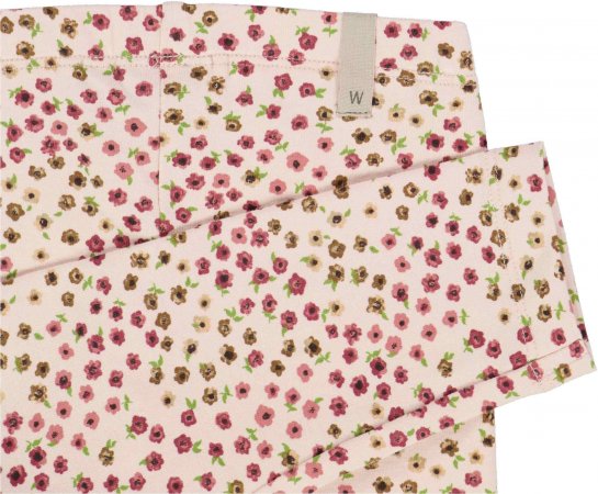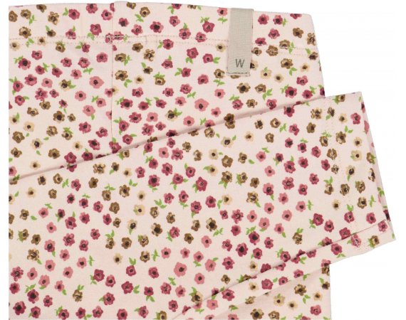 Lækre pudderfarvede leggings med søde blomster i blød økologisk bomuldsblanding. Buksen har elastik i livet, er let stumpet i modellen og har en smal kropsnær pasform. Leggings er bredt anvendelige og kan bruges under en kjole, til en t-shirt eller sammen med en body.