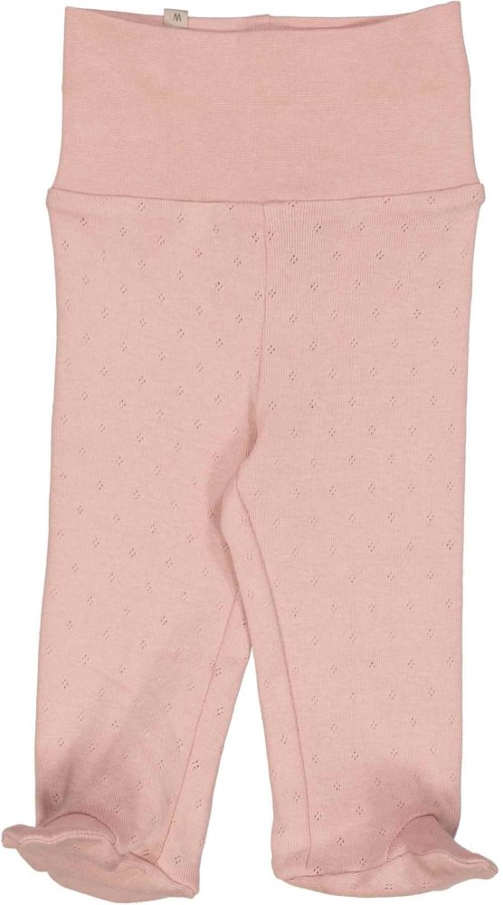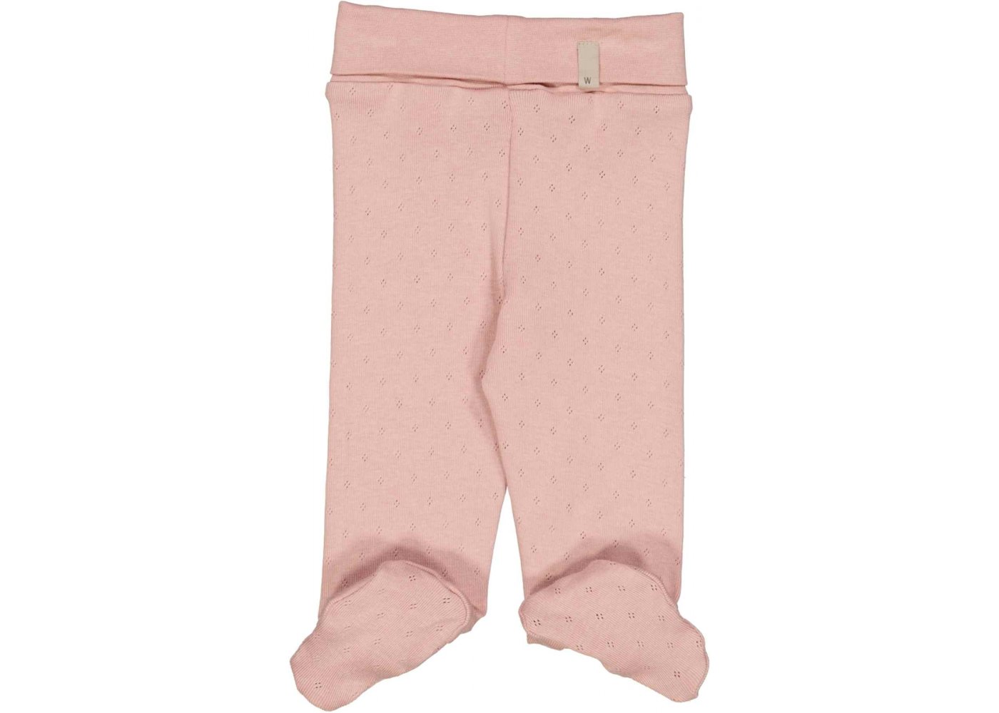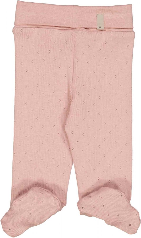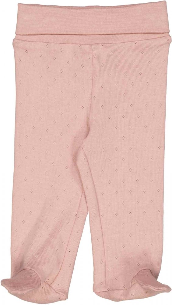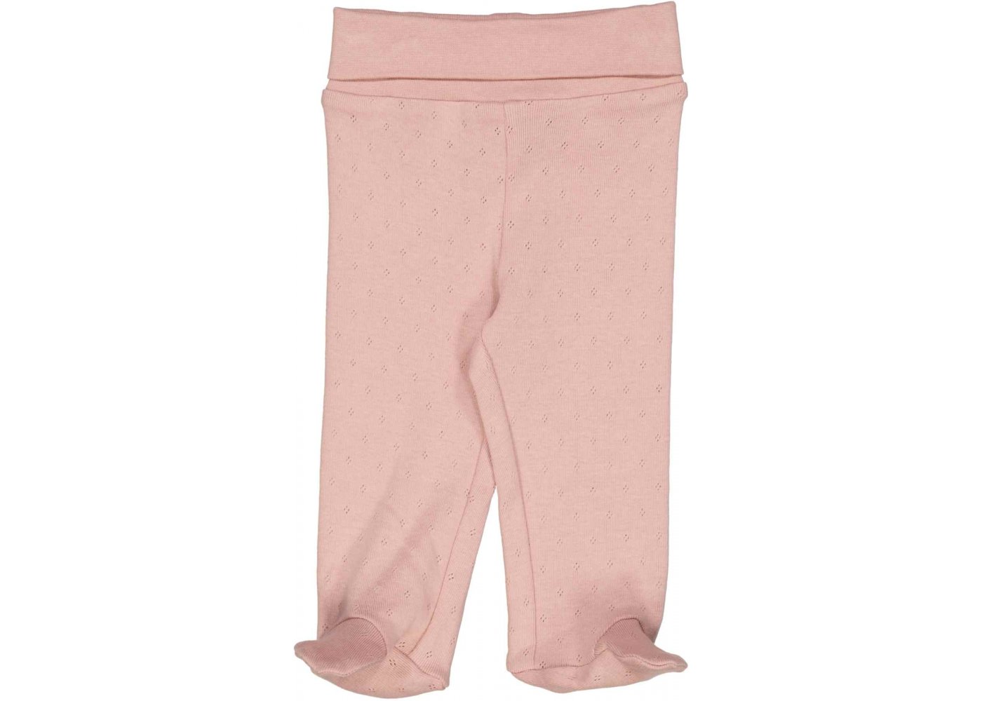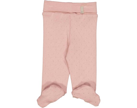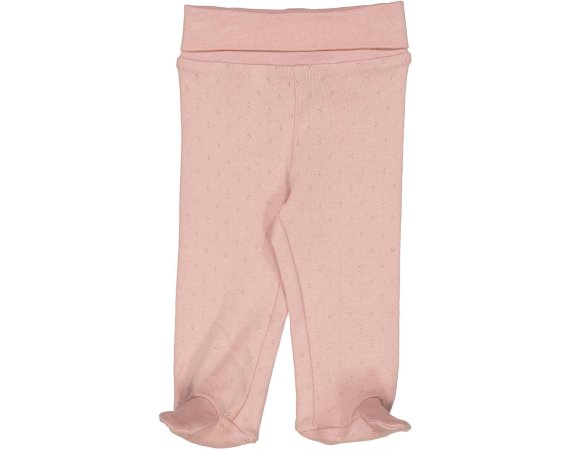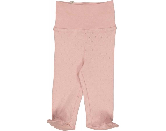 Lækre økologiske bomulds bukser strikket i et klassisk pointelle-strikmønster. Bukserne har et ekstra bredt bærestykke i taljen, som kan foldes ned efter ønske. Bukserne har fødder og kan holde babys fødder varme.