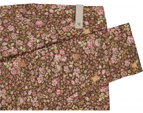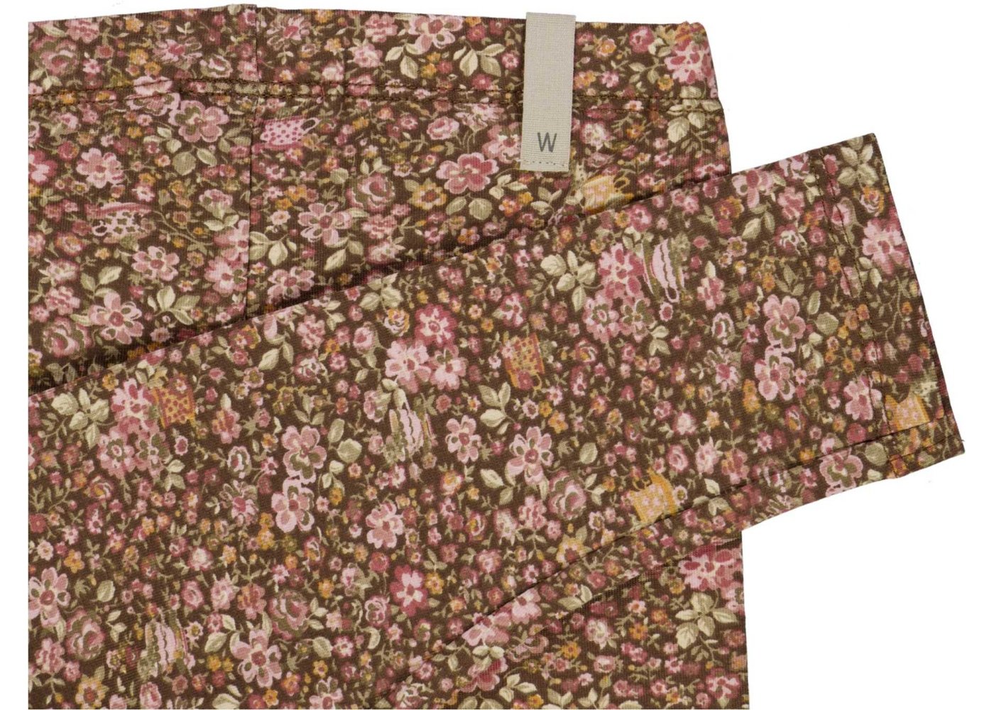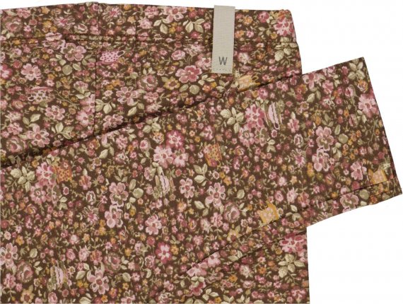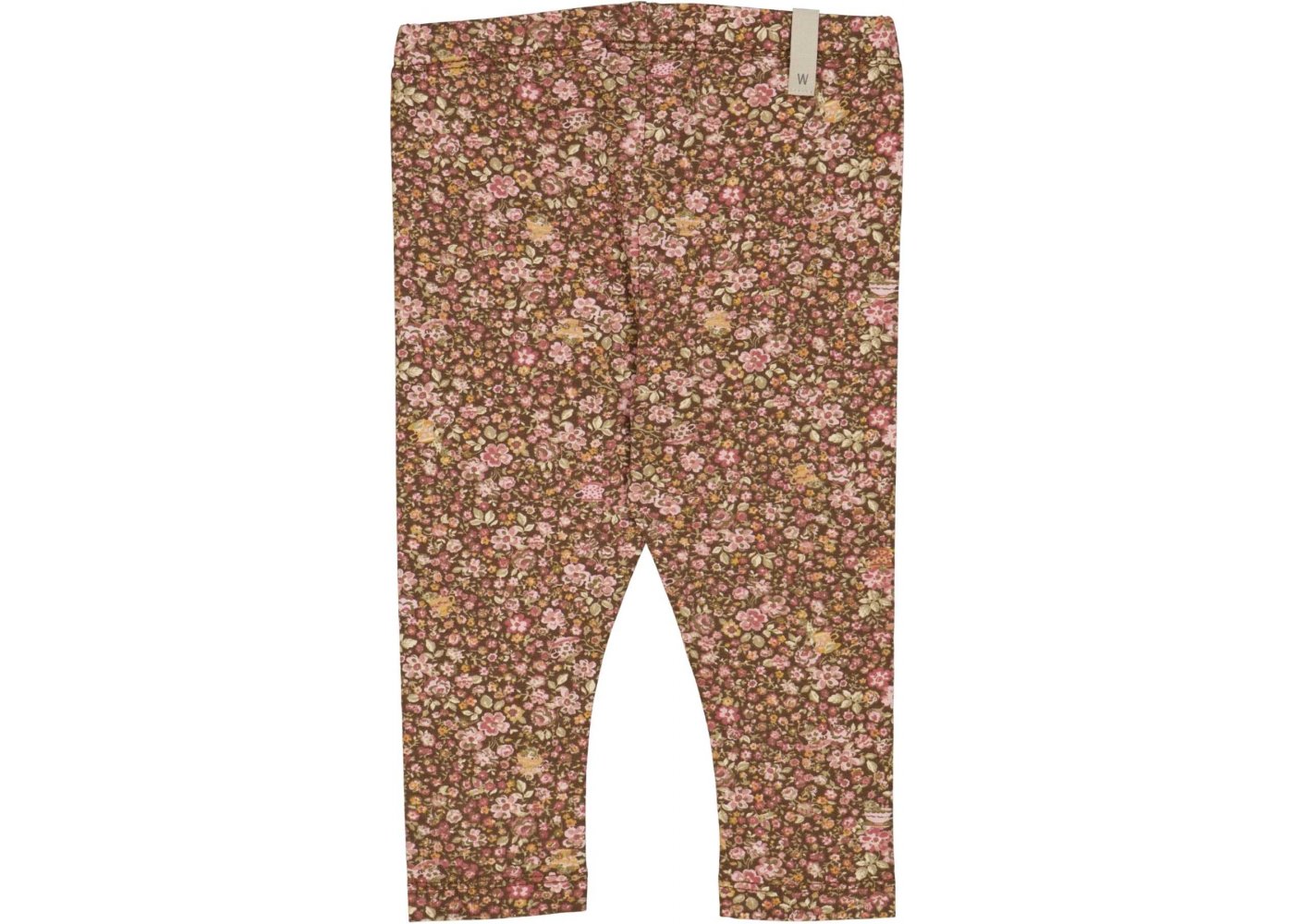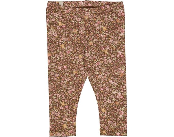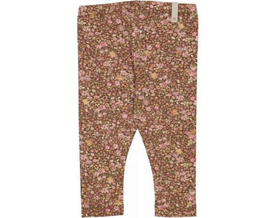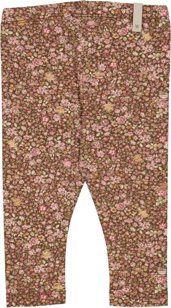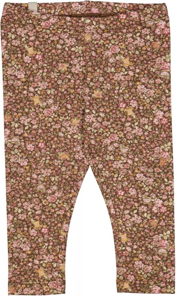 Lækre brune leggings med flot håndtegnet blomsterprint, tekopper og mus i rosa, gule og grønne nuancer.