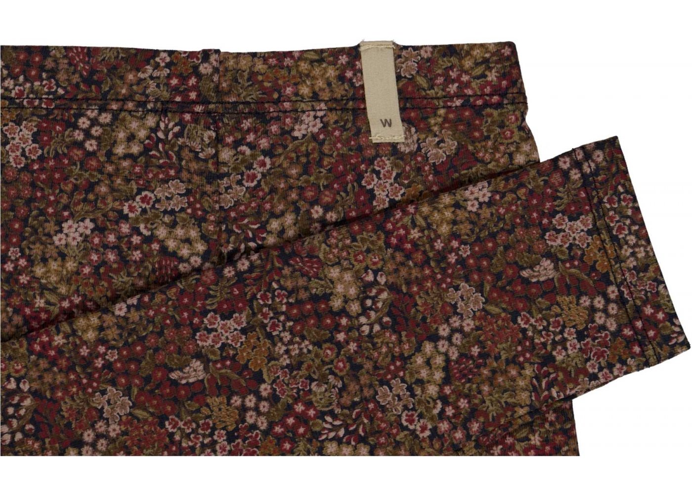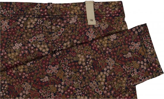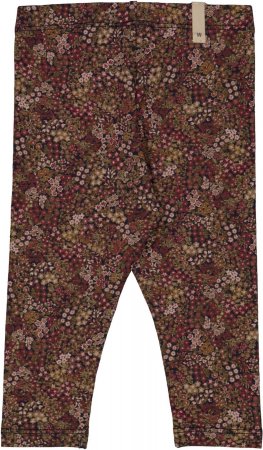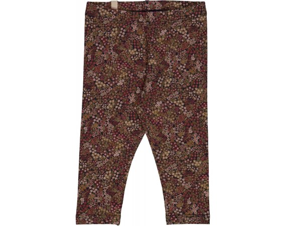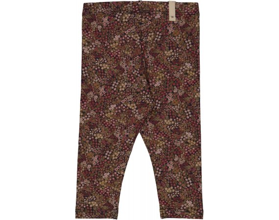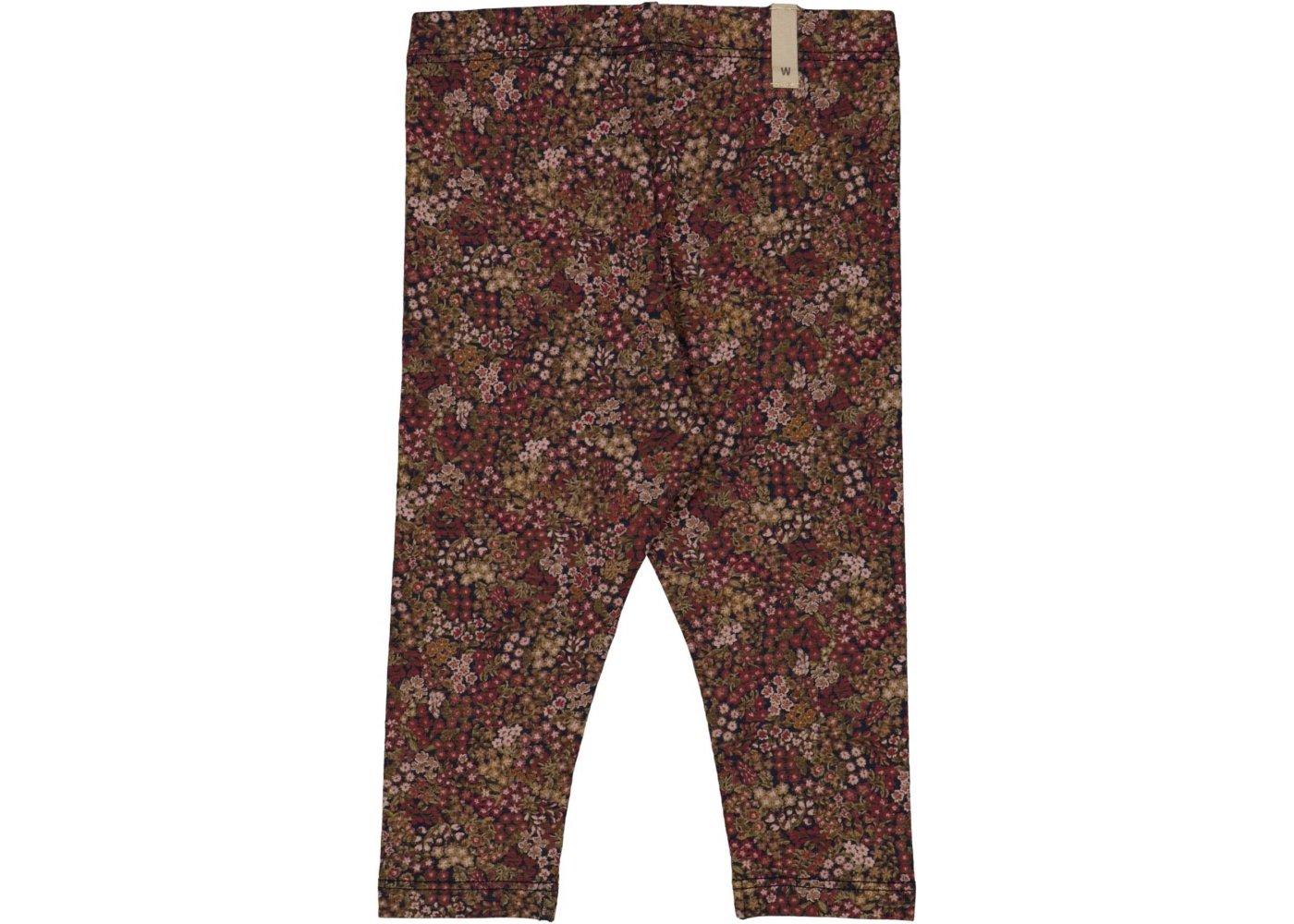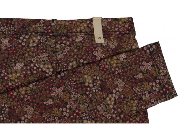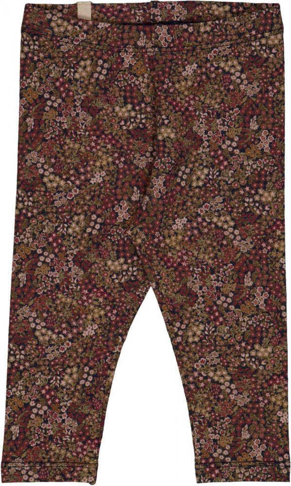 LÊkre blå leggings med håndtegnet blomsterprint og bÊr i røde, hvide og grønne dÊmpede efterårsnuancer.