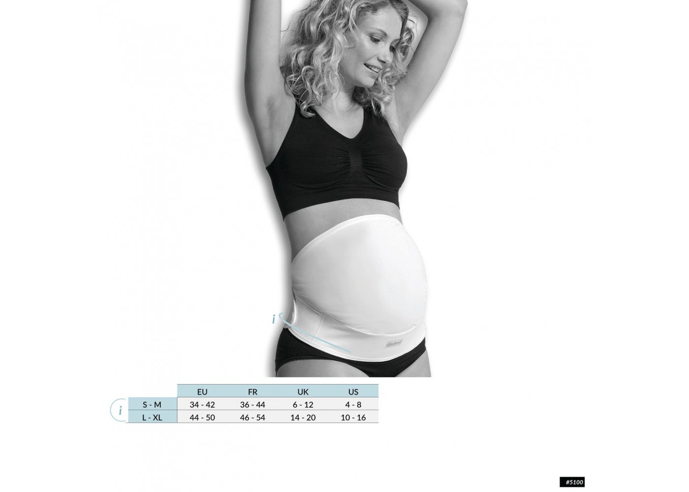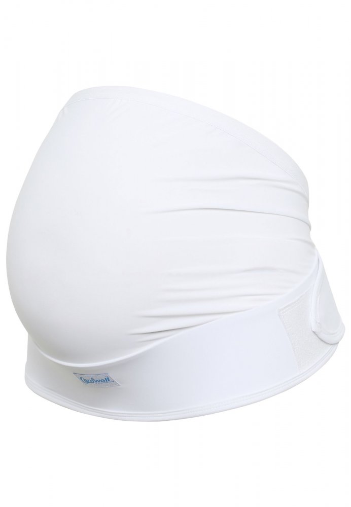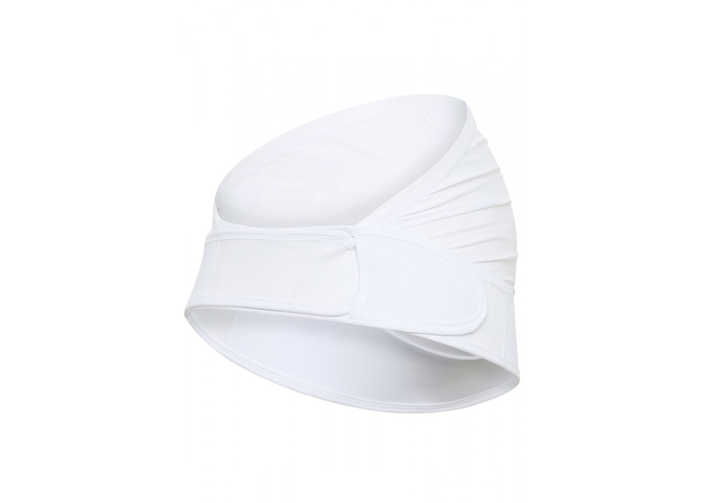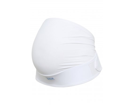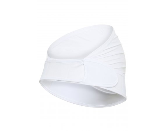 Støttebælte i hvid der mindsker ryg- og lændesmerter under graviditet.