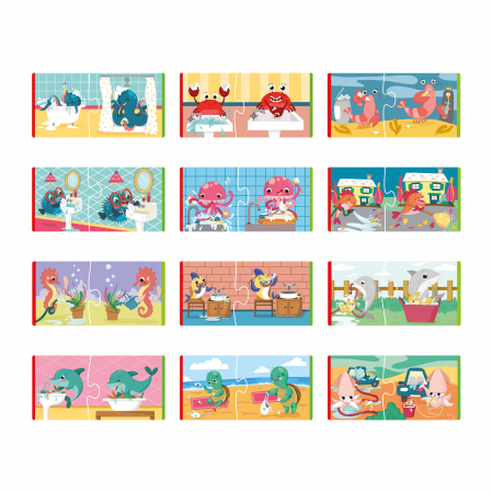 Puslespillet består af små mini-gåder, der lærer børn at korrigere dårlige vaner, ved at forbinde dem med korrekte vaner. Brikkerne har farvede kanter og passer sammen to og to. Barnet opdager på en sjov måde forskel på frås og vandspild over for miljørigtige hensyn.