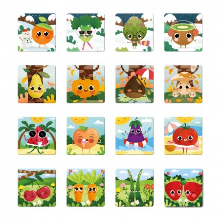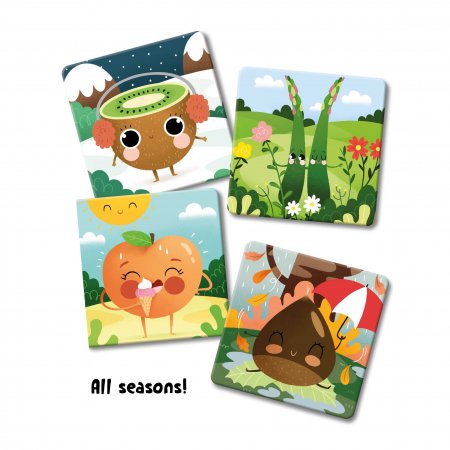 Huskespillet er et almindelig klassisk spil, hvor barnet skal finde 2 ens brikker. Baggrundsmotivet på de 2 matchende brikker skildrer årstiden, så det er lettere at finde de to kort, der hører sammen.