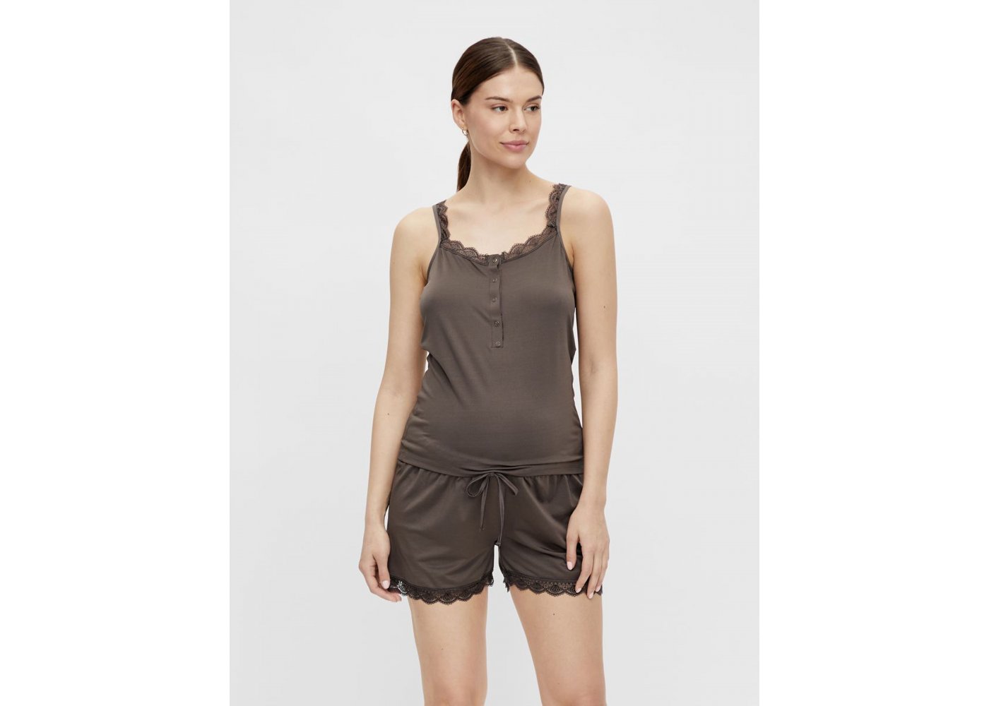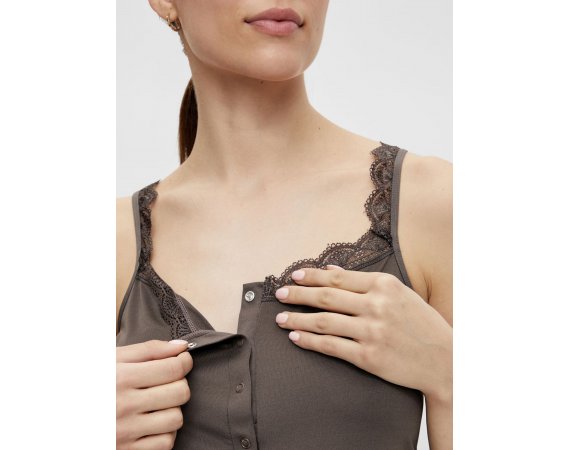 Toppen er smart med fine blondestropper og stolpelukning foran, der kan knappes op, så du let kan komme til at amme dit barn.