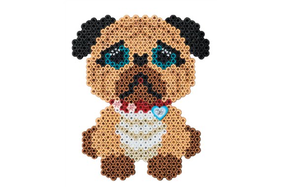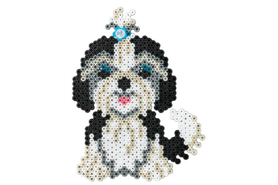 Gaveæsken med hunde leveres med ca. 4.000 perler, 3 medium sekskantede plader nr. 329, 4 perlefødder,1 konnektor, 1 blyant, 1 gems og mosgummi. Desuden motivark, vejledning og strygepapir.