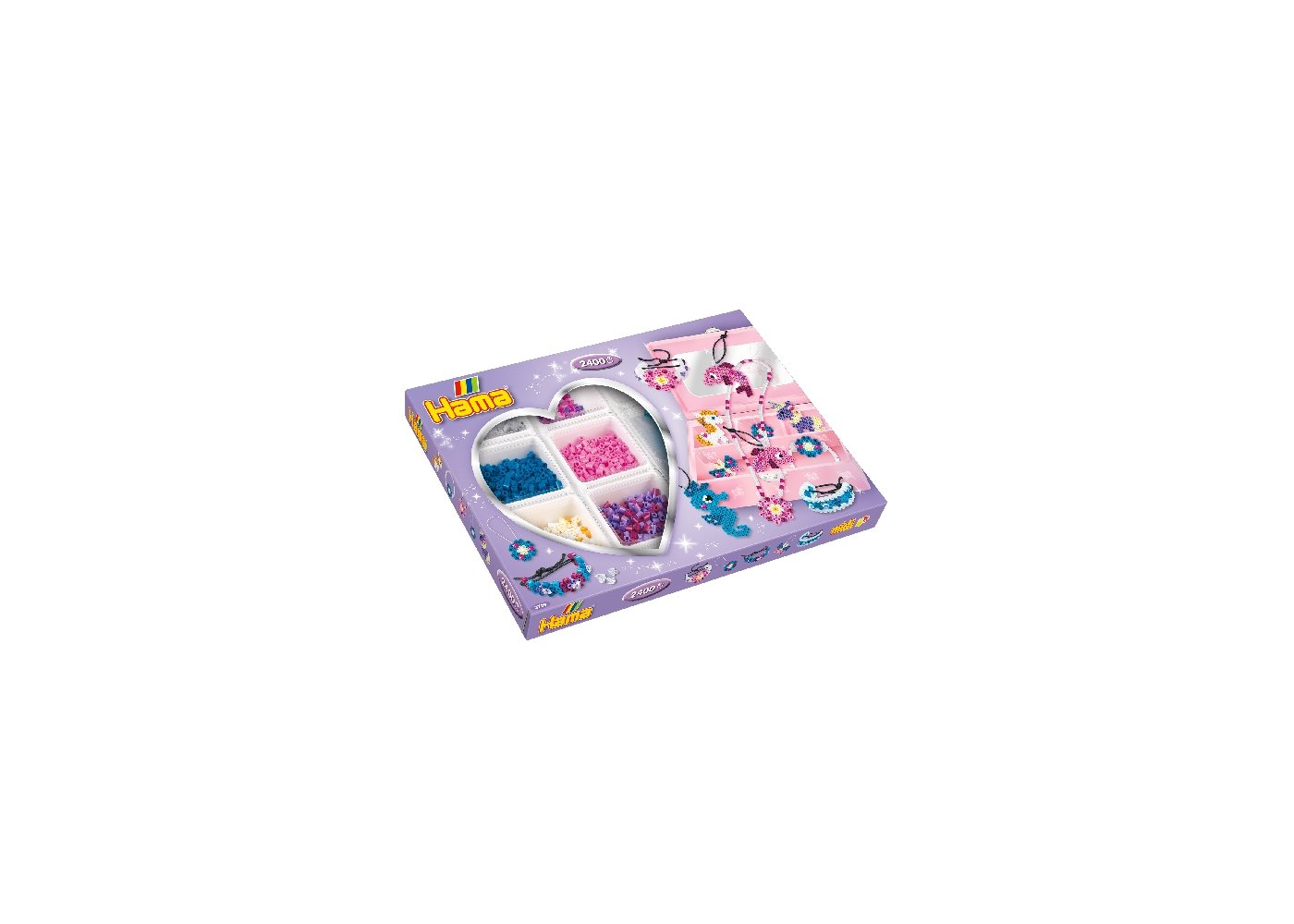 Den åbne aktivitetsæske leveres med ca. 2.400 perler, 1 medium sekskantet perleplade nr. 329, 4 Hama Gems, 1 vokset bomuldssnor, 1 elastiksnor. Desuden motivark, vejledning, strygepapir og 1 opbevaringsæske med låg.