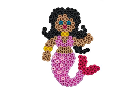 Denne transparente plast bøtte med skruelåg indeholder ca. 15.000 stk. midi perler + 3 små perleplader (firkant nr. 220,05, blomst nr. 327, havfrue nr. 332-48). Desuden motivark, vejledning samt strygepapir.