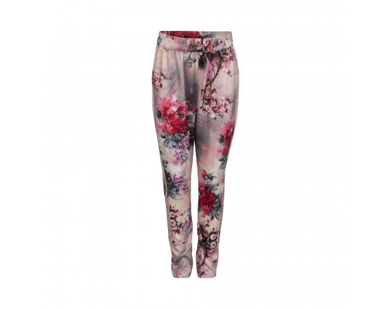 Rosa bukser i et glat og luftigt stof med allover print af blomster, sommerfugle og grene.