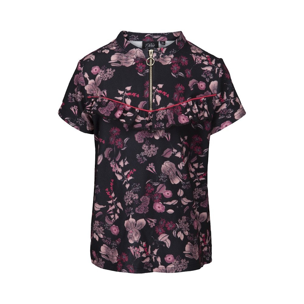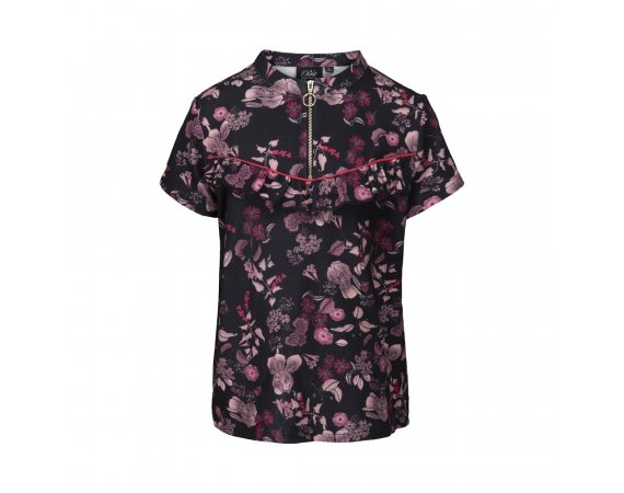 Sød blomstret topmed flæsekant over brystet og lynlås i halsåbning