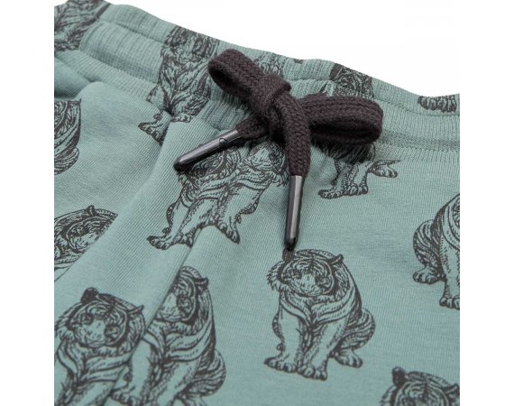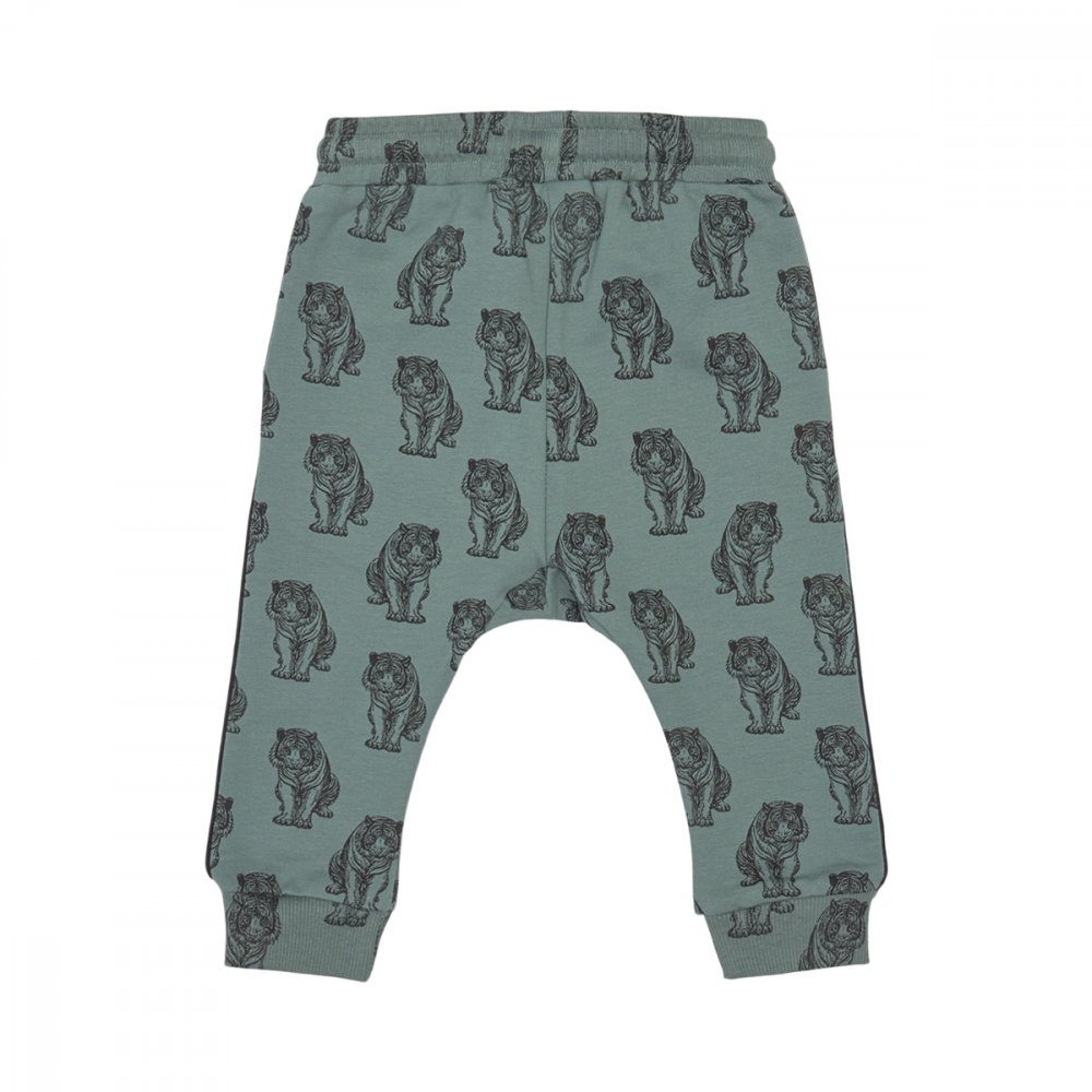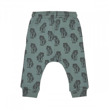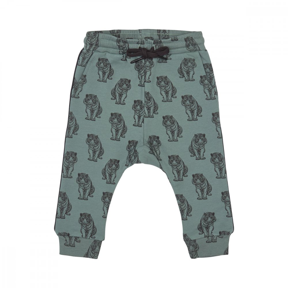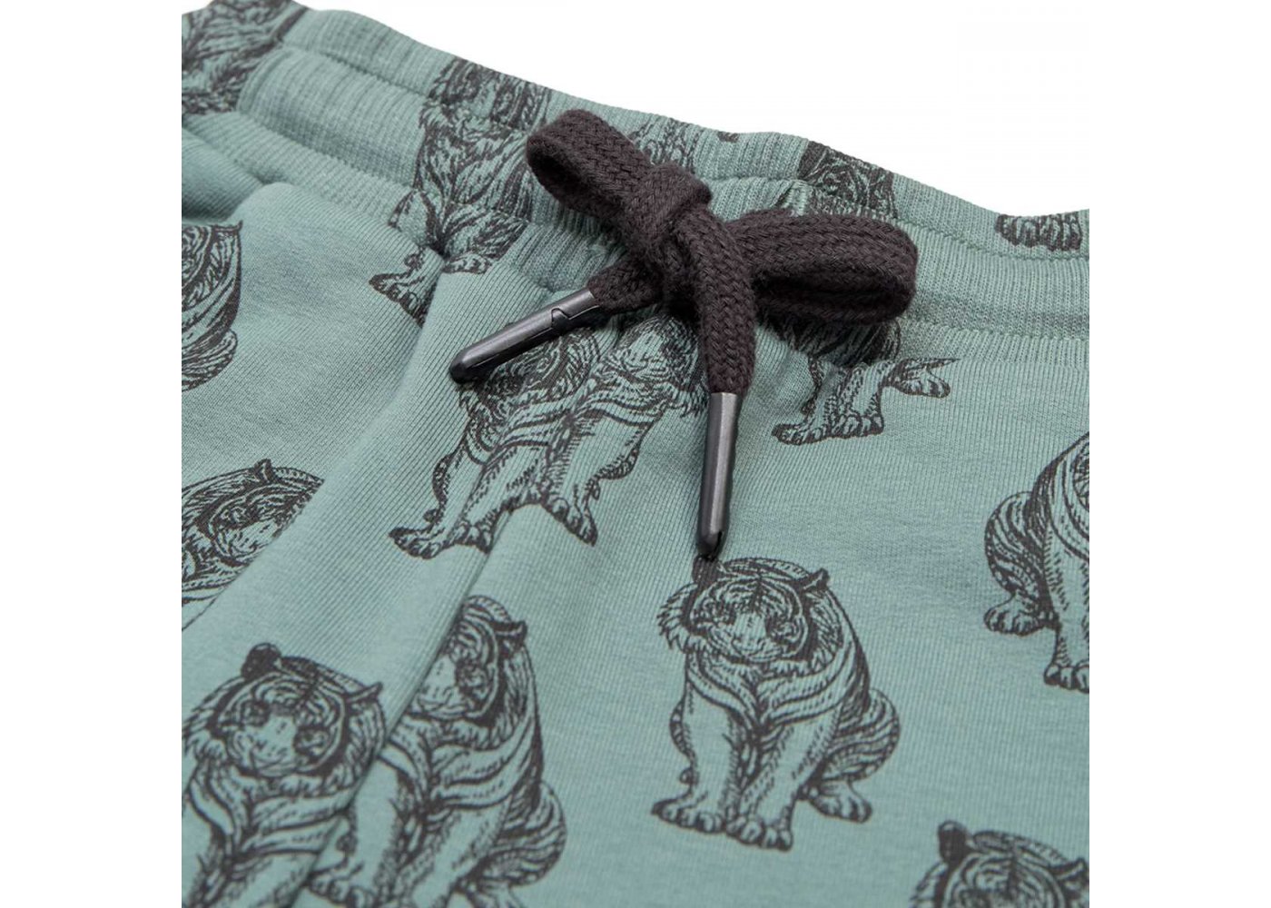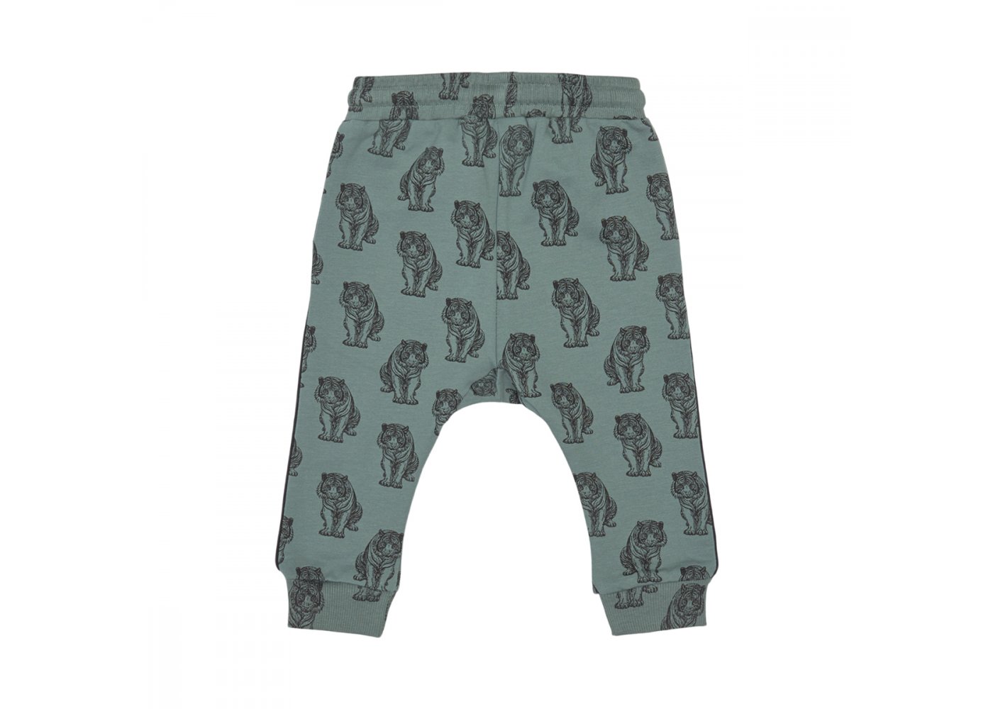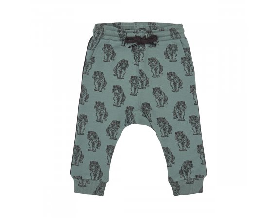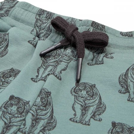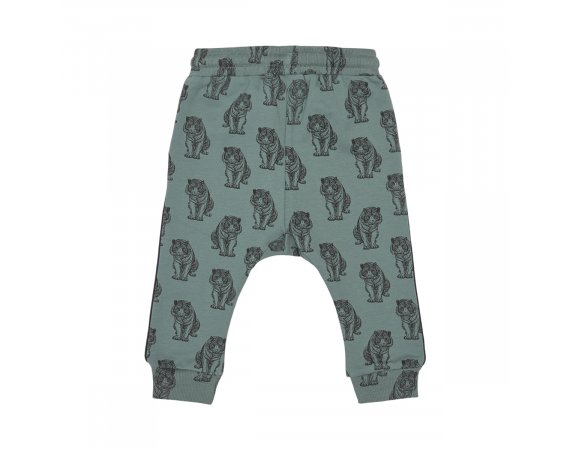 Lækre sweatpants bukser i støvet grøn med sort tigerprint. Bukserne har en bred ribkant med justerbart bindebånd i talje og bred ribkant ved ankler. Bukserne har lommer i siden og fin sort tittekant på ydersiden af bukseben.