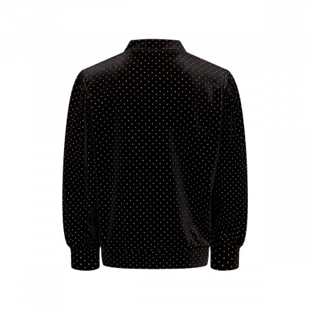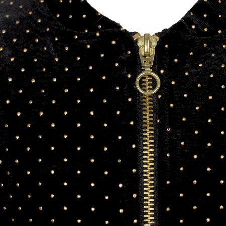 Smart sort Bomber jakke fra Sofie Schnoor Jakken er i velour med fine små guld prikker over det hele. Den har bløde puf ærmer og som en ekstra fin detalje, har den en guld lynlås. En flot jakke der kan være rigtig fin til festlige anledninger.