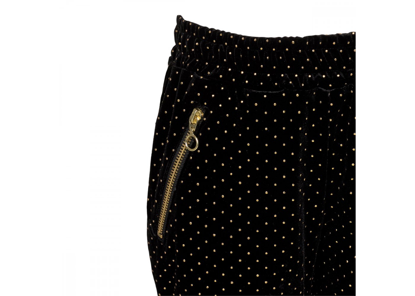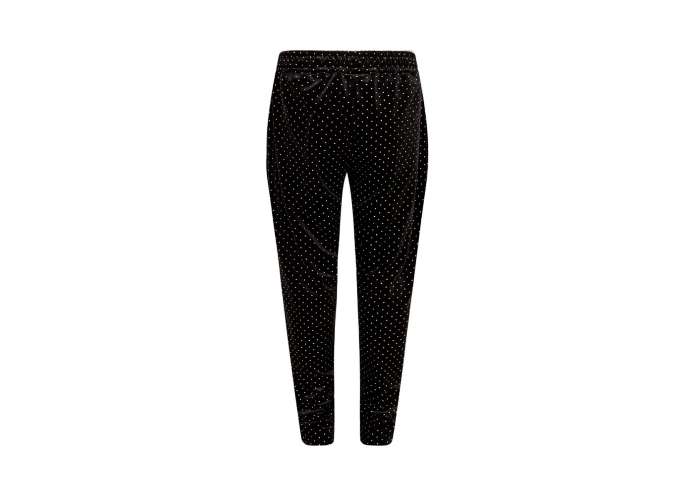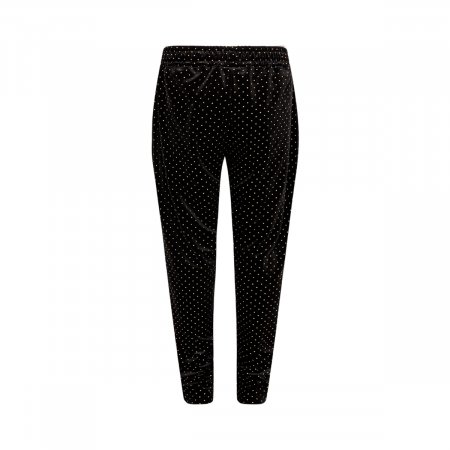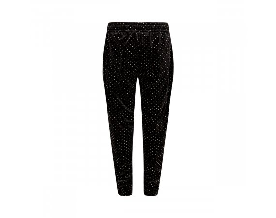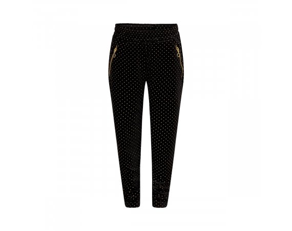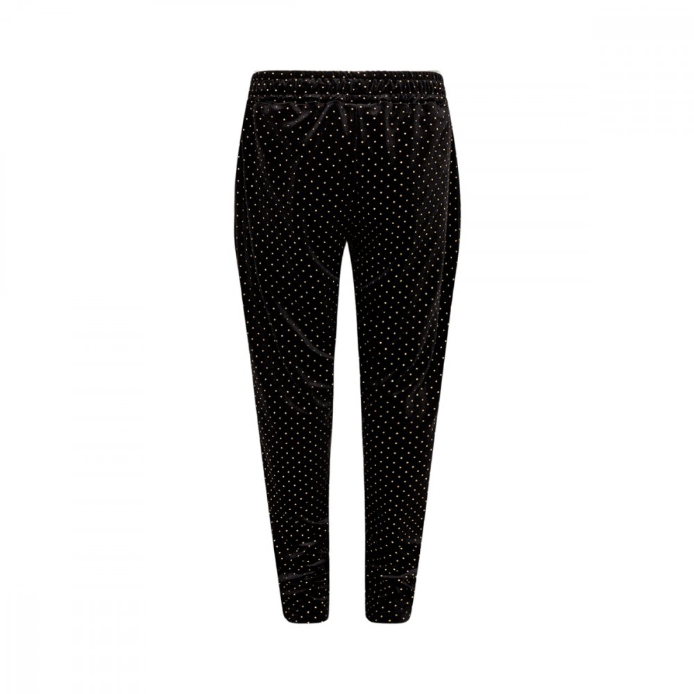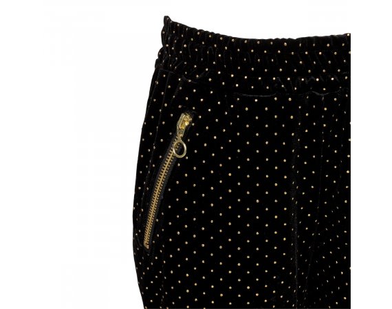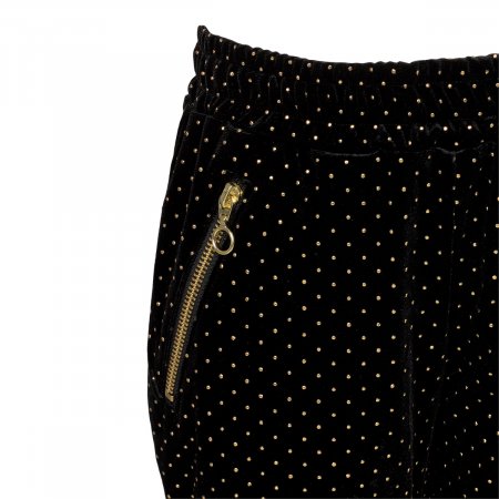 Smarte sorte bukser fra Sofie Schnoor Bukserne er i velour med fine små guld prikker over det hele. Buksen har flotte skrå lommer med guld lynlås i sider. Flotte bukser der kan være rigtig fine til festlige anledninger.