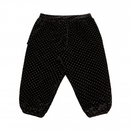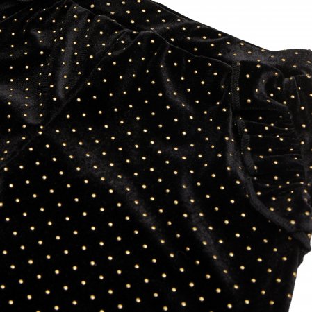 Cool, black trousers from Sofie Schnoor. The trousers are velvet with pretty little gold dots all over. The trousers have slim elastic bands at the legs and pretty ruffles on the sides. The trousers have an inner adjustable elastic waistband. Beautiful trousers for festive occassions.