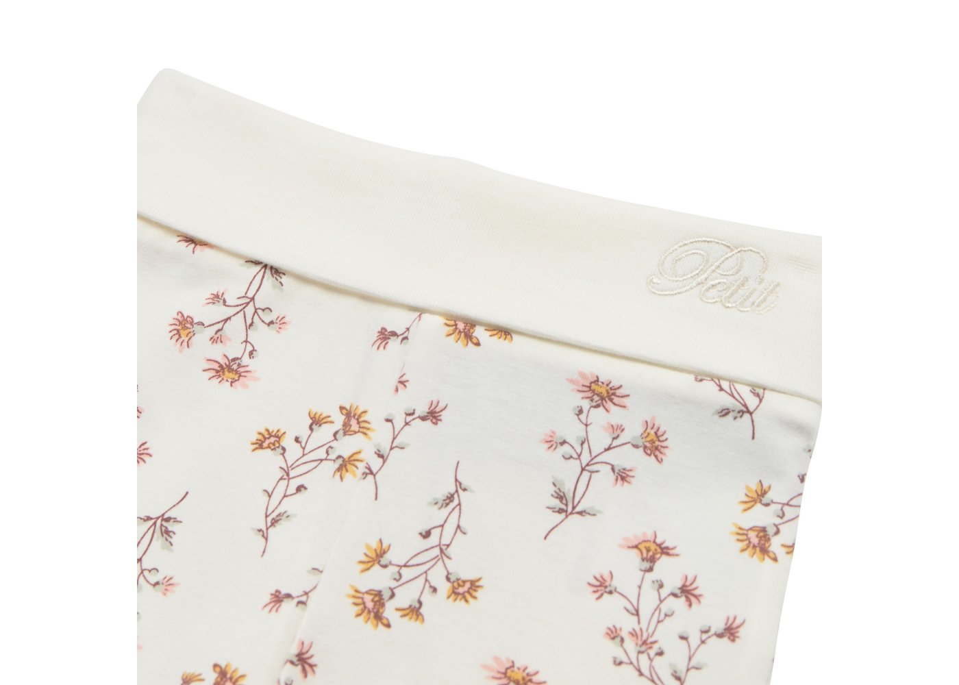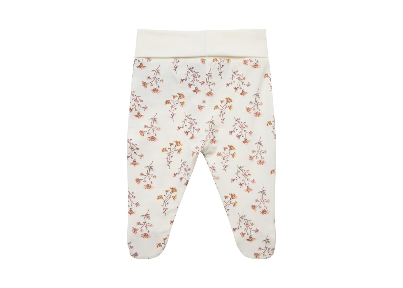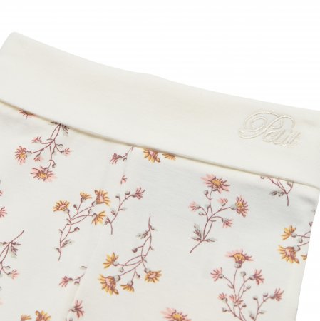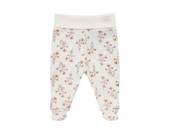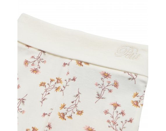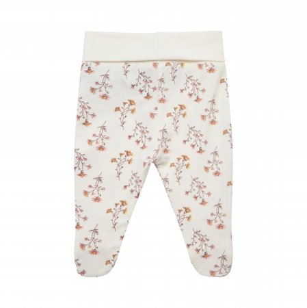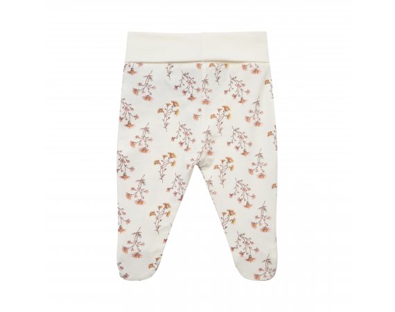 Buksen har print med blomstergrene i brun og beige, og har en bred hvid ribkant med ombuk i livet.Suppler eventuelt med hue og body i samme design.