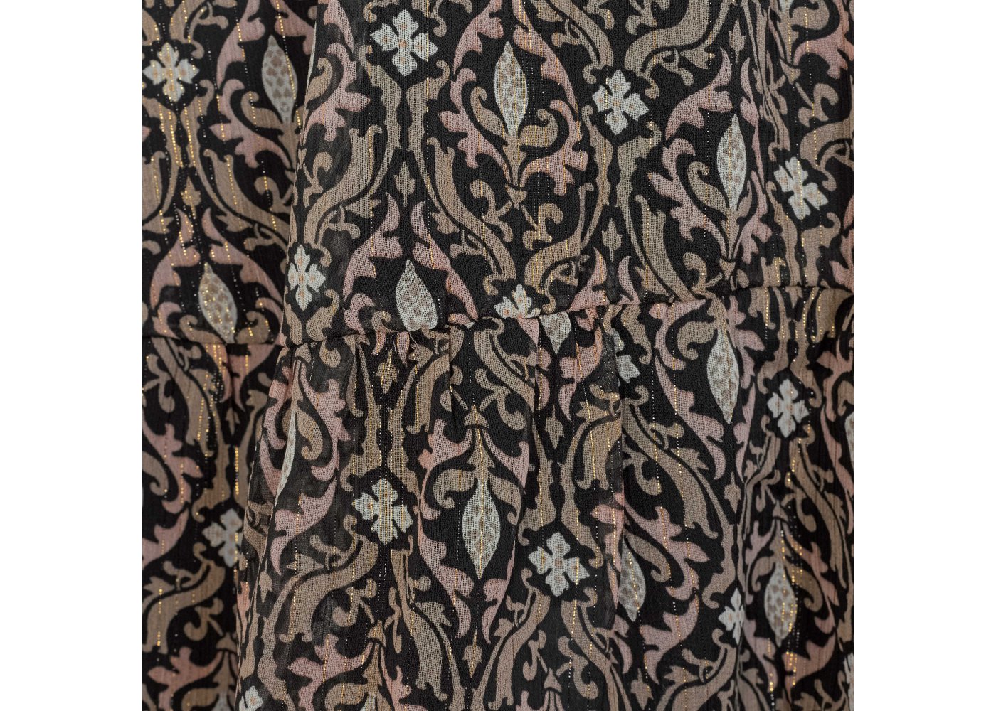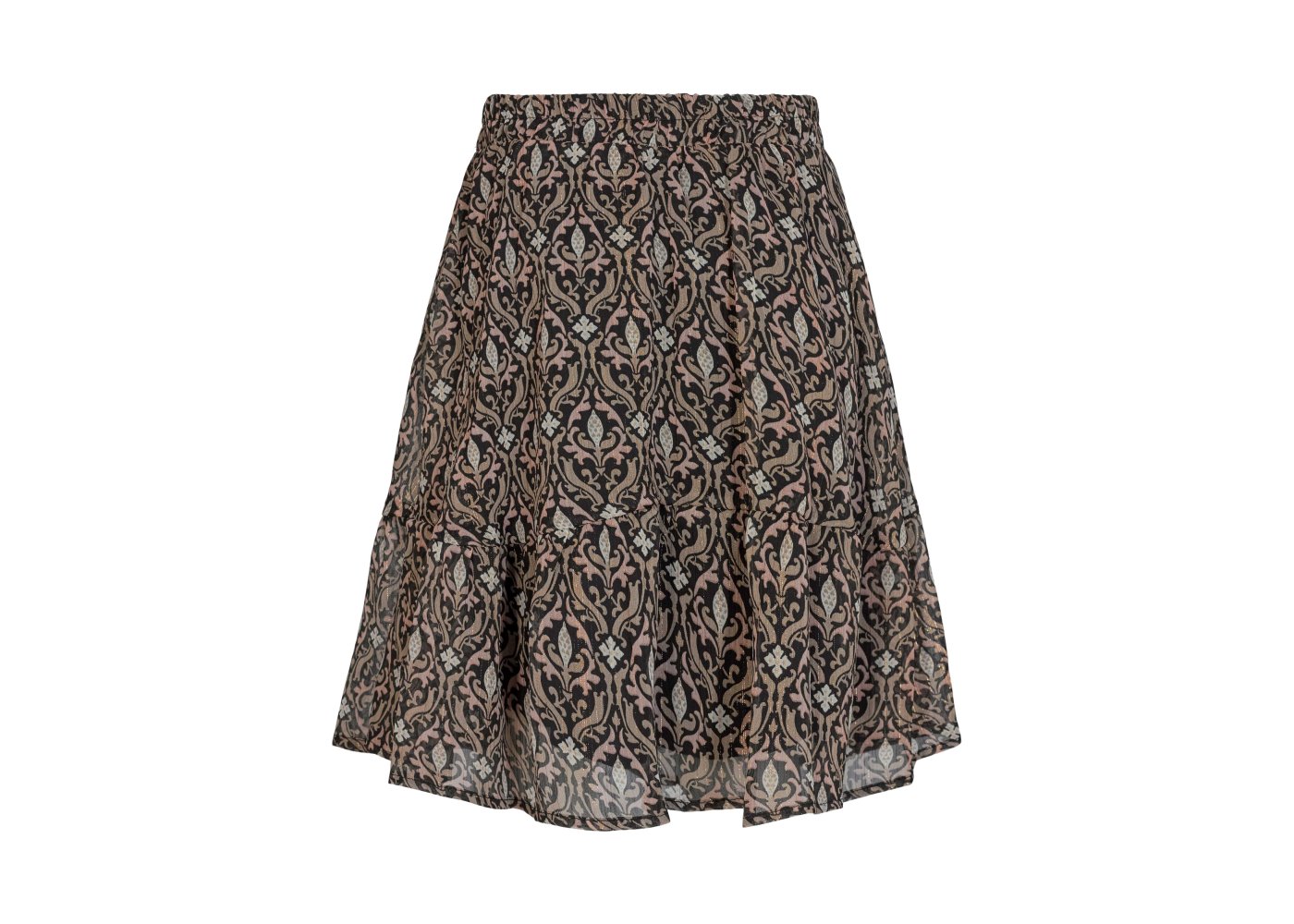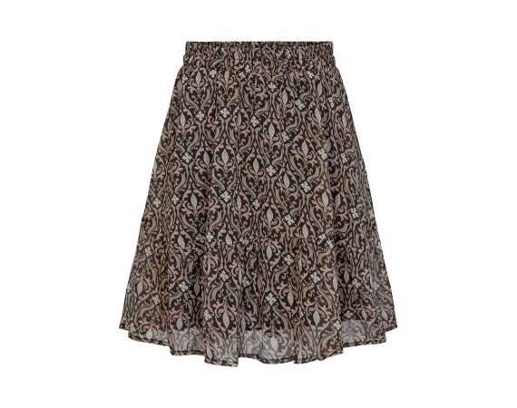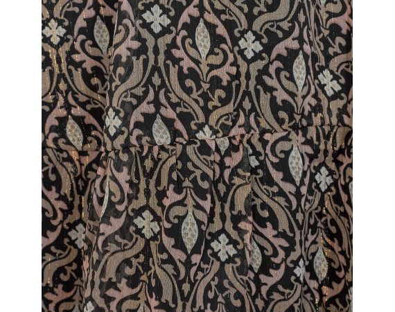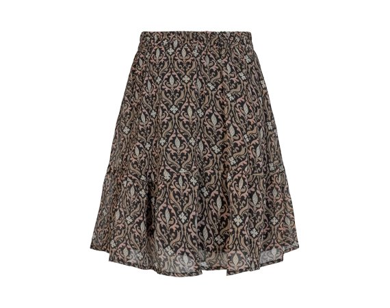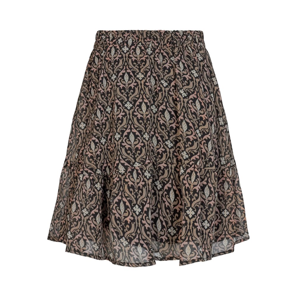 Nederdelen er sort i bunden og har fine guld striber. Den har en bred elastik i taljen, som giver skørtet et flot fald. Den har underskørt, så den ikke fremstår gennemsigtig.