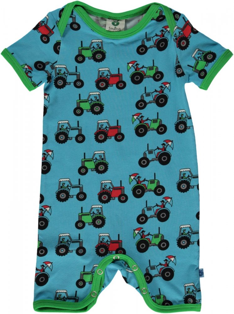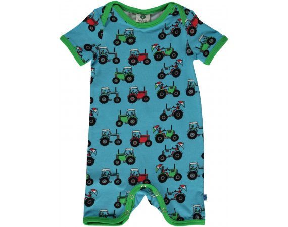 Heldragt med korte ærmer og fast ribkant i halsudskæring, i ben og ved ærmer. Dragten har kuvertlukning ved skuldre og lukkes med trykknapper hele vejen rundt ved ben.