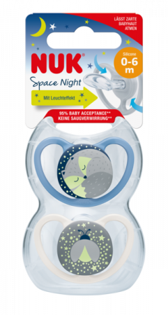 NUK Space Night & Day silikone sut lyser i mørket, og er derfor let at finde om natten.