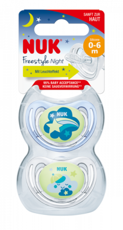 NUK´s Freestyle Night & Day sut er i blød silikone og lyser i mørke. Den er derfor altid let at finde i mørke. Sutten har et luftigt skjold, der berører barnets hud minimalt. Den gode ventilation forhindrer hudirritation, giver maksimal luftcirkulation og sørger for, at barnets følsomme hud kan ånde. Forsiden pa sutten er flad, og har en integreret ring.