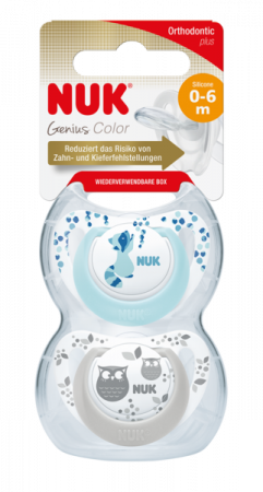 Genius serien er et stilrent design med fine farver og en ergonomisk form, der passer til det lille barns anatomi. Sutten har NUK Air System som sikrer, at luften kan strømme frit igennem sugedelen. Den beholder sin form, mindsker belastning pa barnets kæbe, giver maksimal luftcirkulation og forhindrer hudirritation.