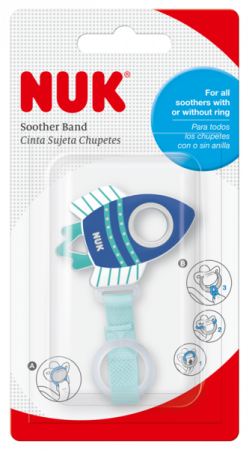 Smart og praktisk suttesnor fra NUK med en rumraket i grøn, hvid og blå farve.