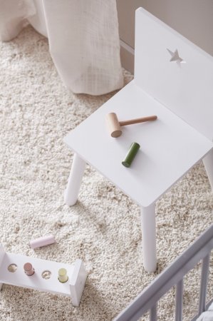 Børnestolen fra Kid´s Concept er hvidmalet og har en flot stjerneudskæring i stolens ryg. En stol der kan matche og passe ind i ethvert børneværelse. Der findes et bord, gyngestol og sminkespejl i samme design. Stolen er fremstillet i fyr og birketræ.